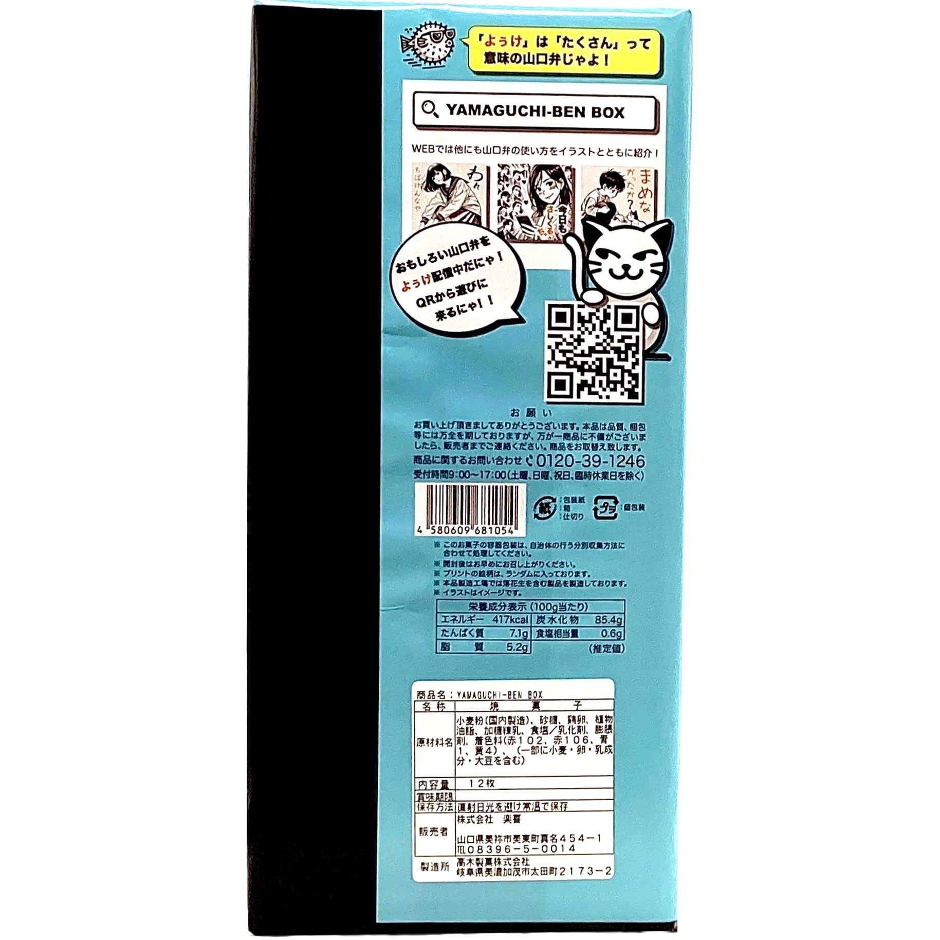 山口県のユニークな方言がイラストとともにプリントされた、卵せんべいです。